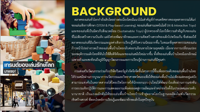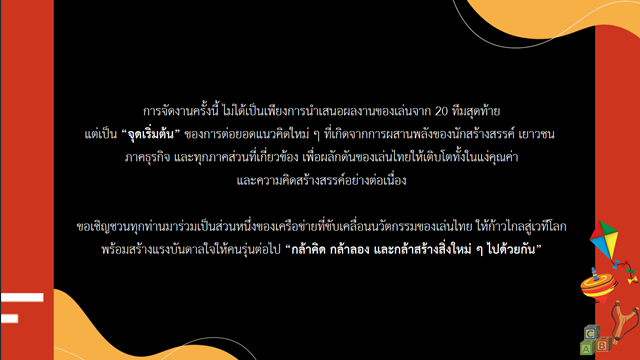 กิจกรรมนี้เป็นหนึ่งในโครงการยกระดับของเล่นพื้นบ้านภูมิปัญญาไทยผ่านนวัตกรรมวิทยาศาสตร์สมอง ”Replay History เรื่องไม่เล่น ของเล่นวิถีไทย“ เพื่อต่อยอดสู่การผลิตและจำหน่ายจริงทั้งในประเทศและระดับนานาชาติ โดยมีผู้เข้ารอบสุดท้าย 20 ผลงาน และจะจัดนิทรรศการ พร้อมประกาศผู้ได้รับรางวัล ในวันที่ 11 มิถุนายน 2568 นี้ โดยจะมีกิจกรรมจับคู่ธุรกิจ Business Matching สำหรับผู้ที่สนใจผลงานดังกล่าว เพื่อต่อยอดทางธุรกิจให้สำเร็จ
